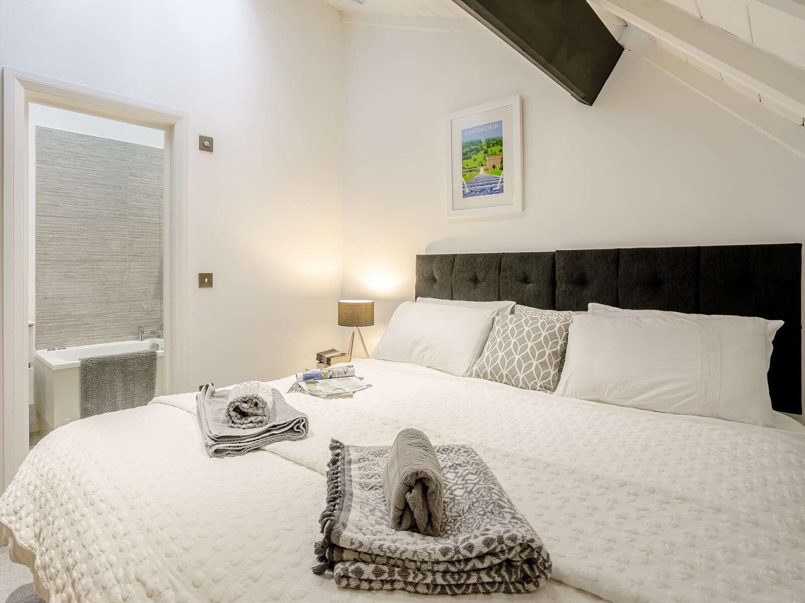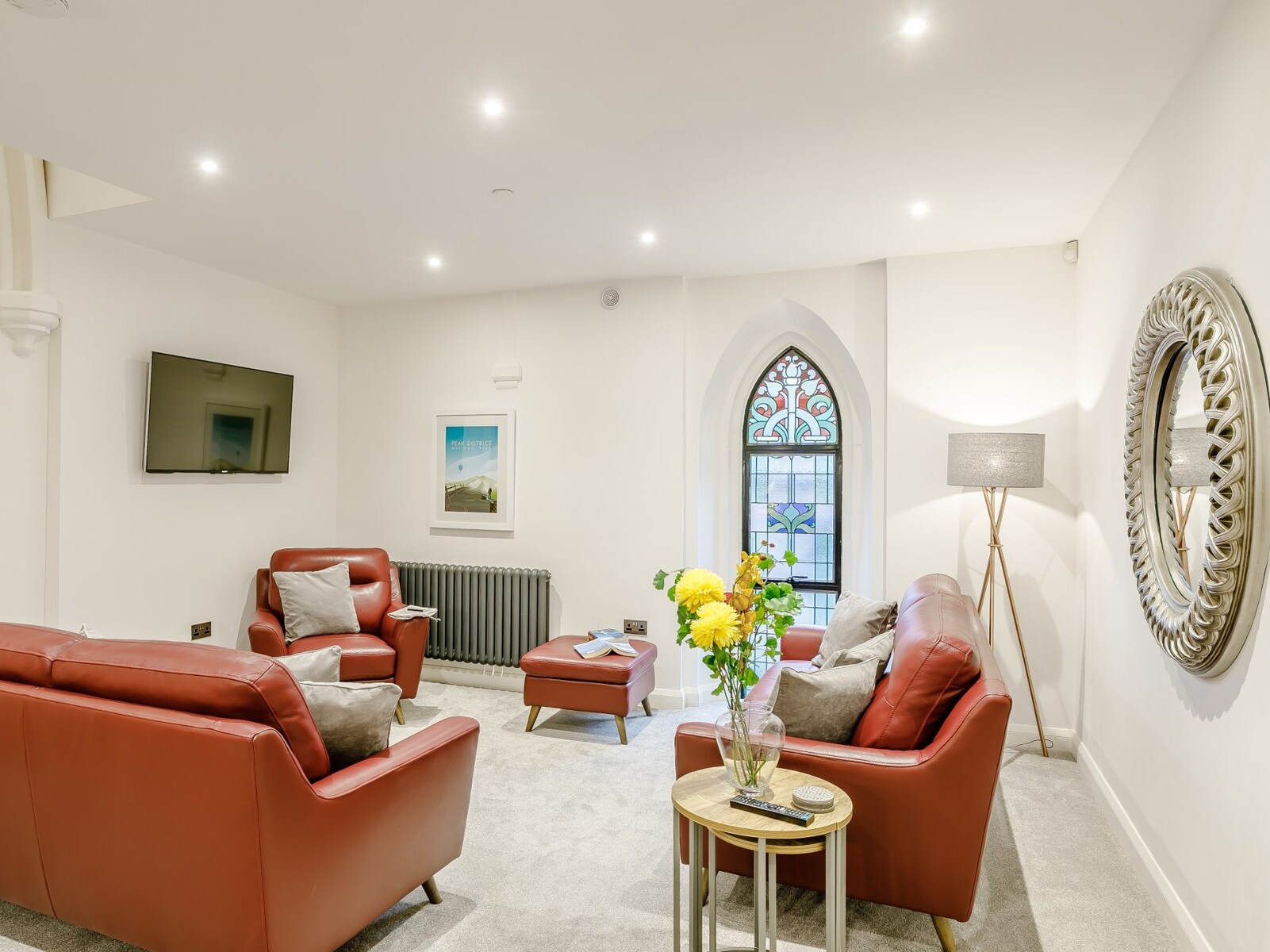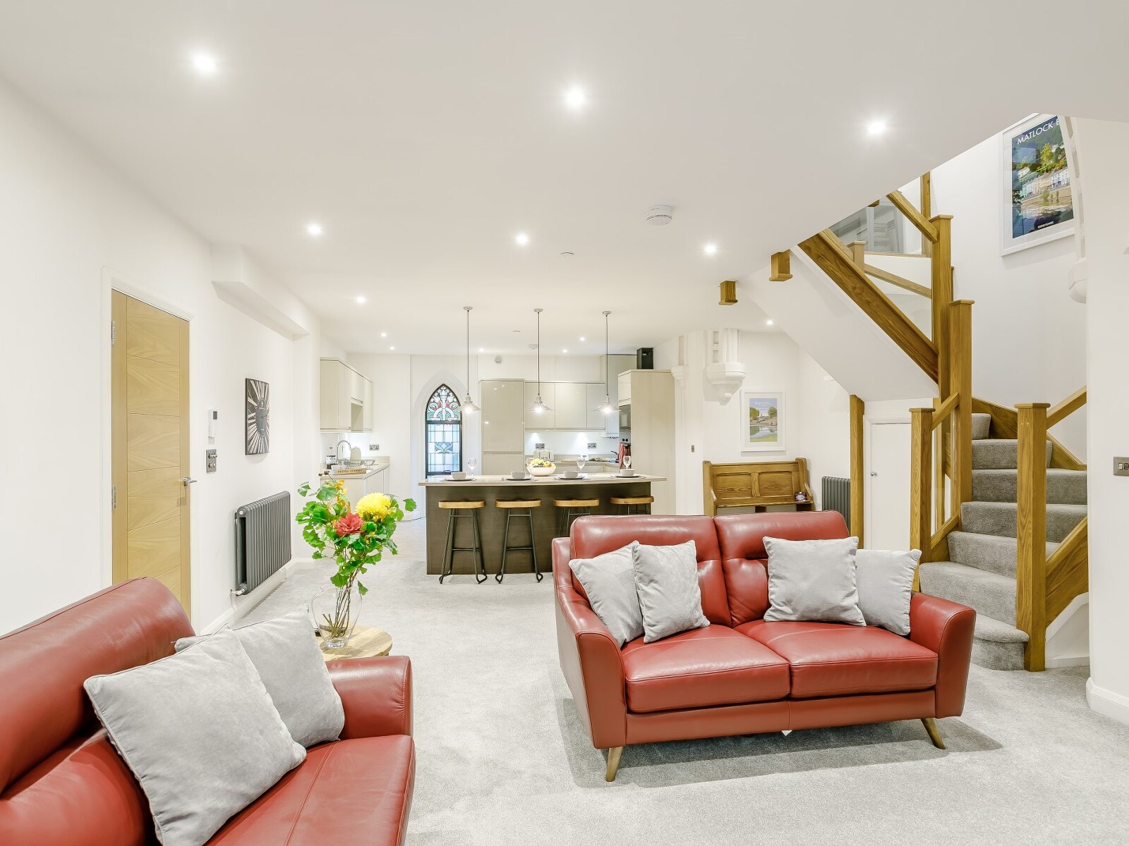 You enter into this bright, airy and spacious property arriving into a small hallway which leads into the open-plan lounge/kitchen/diner. The kitchen area has an electric oven and hob, microwave, fridge/freezer, dishwasher and washer/dryer. The chef of the party can rustle up a meal for guests who can sit at the island and discuss the day they had and the adventures ahead over a nice meal and a drink. Heading over to the lounge area you can’t help but admire the original gothic arched windows that provide natural light and this provides the perfect backdrop to where you can relax on the two comfortable sofas and put the smart TV on where you can watch your favourite shows or catch a good film on Netflix. The stairway leads to the original arch of the church which faces the two well-presented bedrooms. The master bedroom has a super-king-size zip-and-link bed that can be made up as a twin on request, it has its own en suite bathroom with shower over spa bath and WC. The second bedroom is a twin with 2’6 beds. Next to the twin room is a shower room with shower and WC.