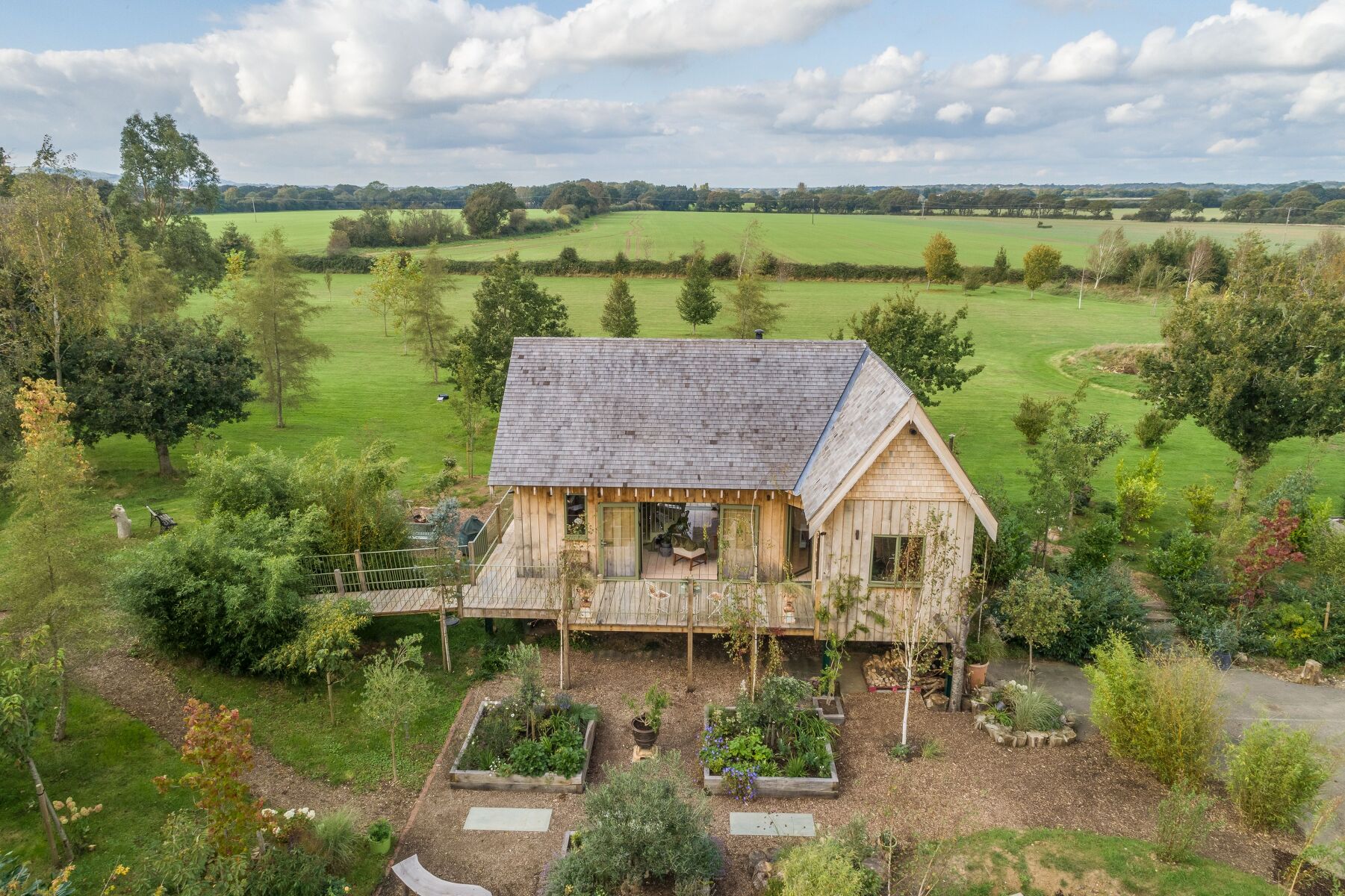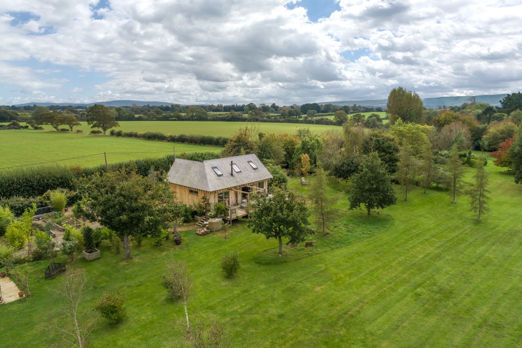 Outside, enjoy the breath-taking rural views from the raised, balconied terrace or climb down to the wood fired, eco hot tub to soothe away the day. As night falls, light the fire pit and enjoy starry evenings and the sound of nearby wildlife.