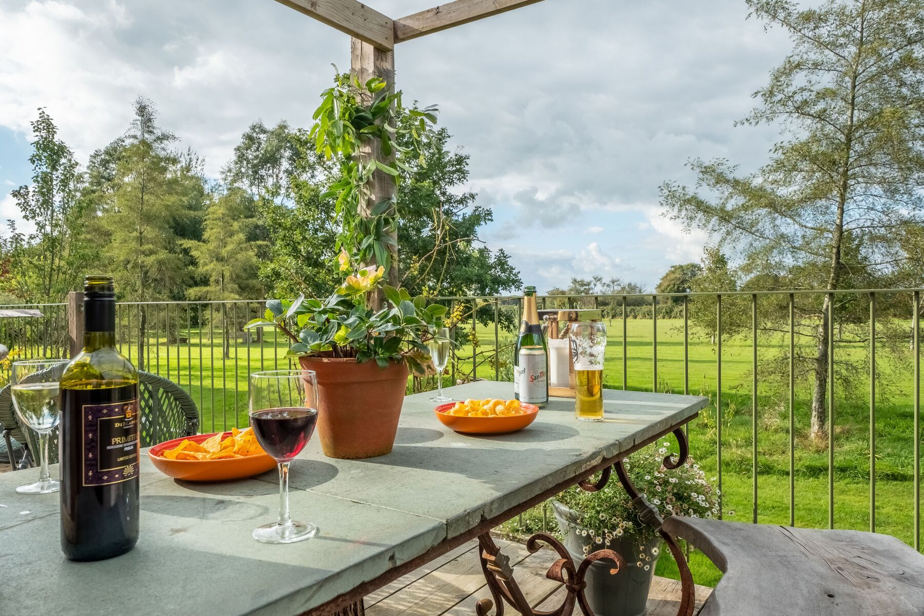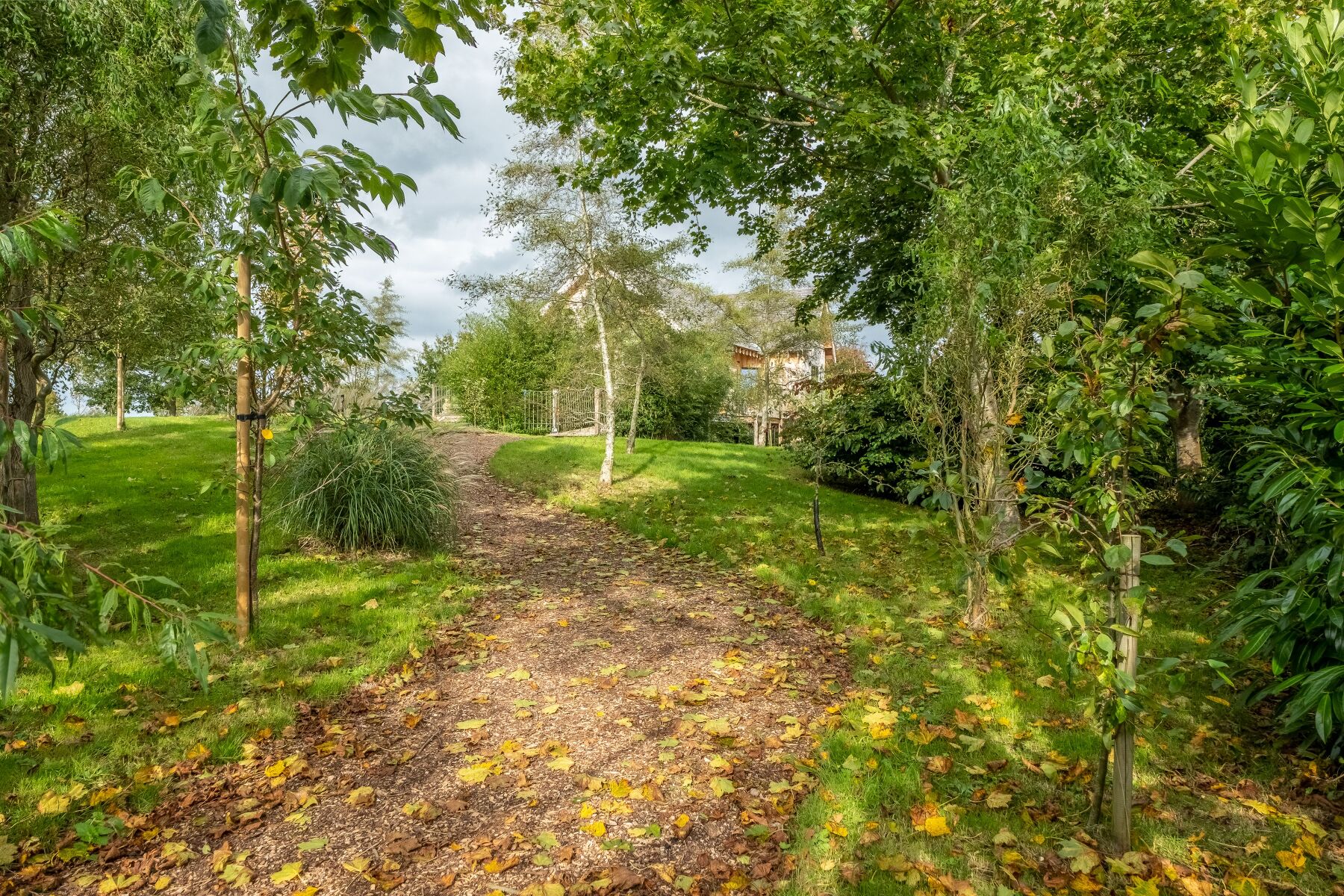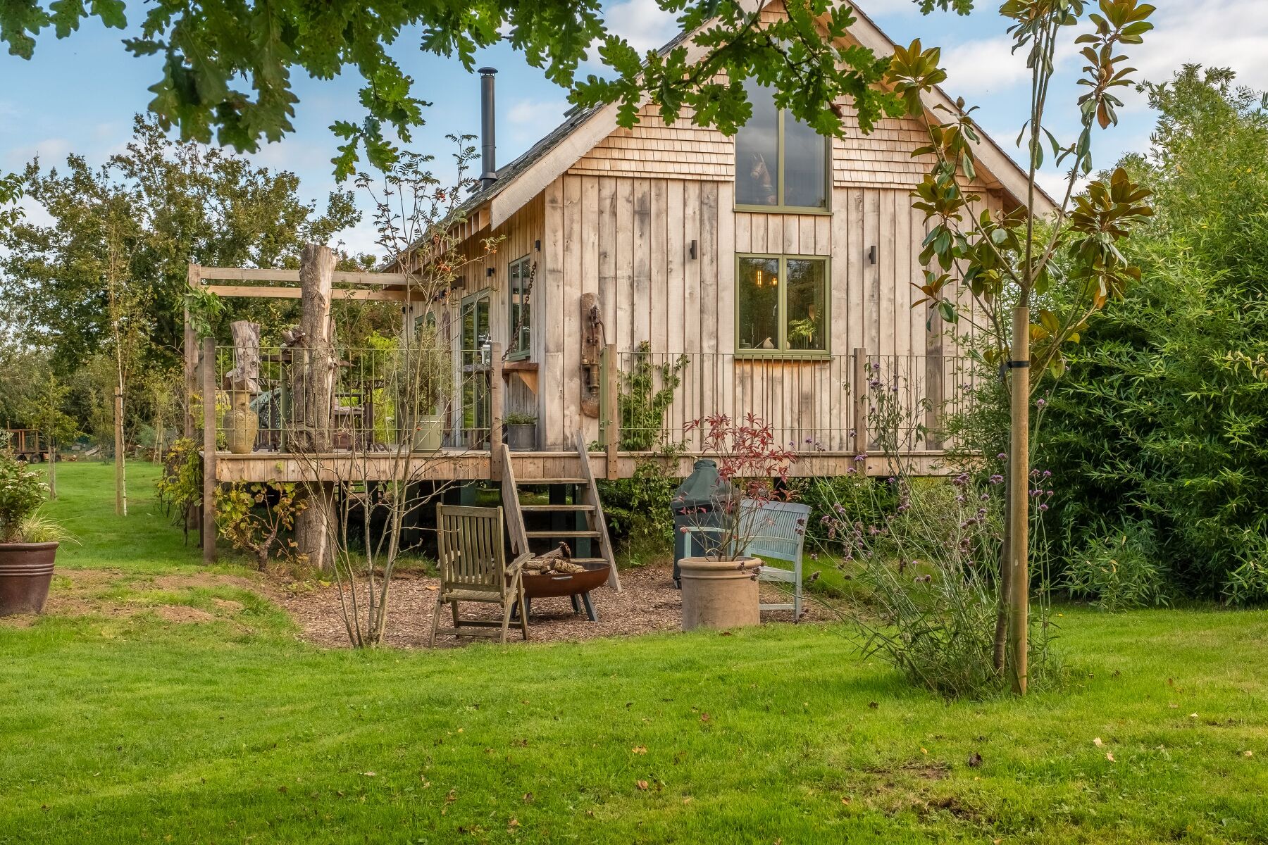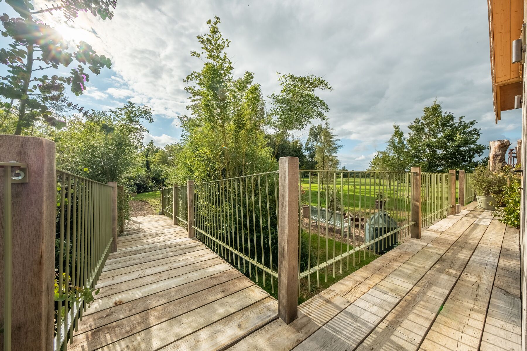 Enclosed garden with lawned area, meadow, pond and raised decked balcony with garden furniture.