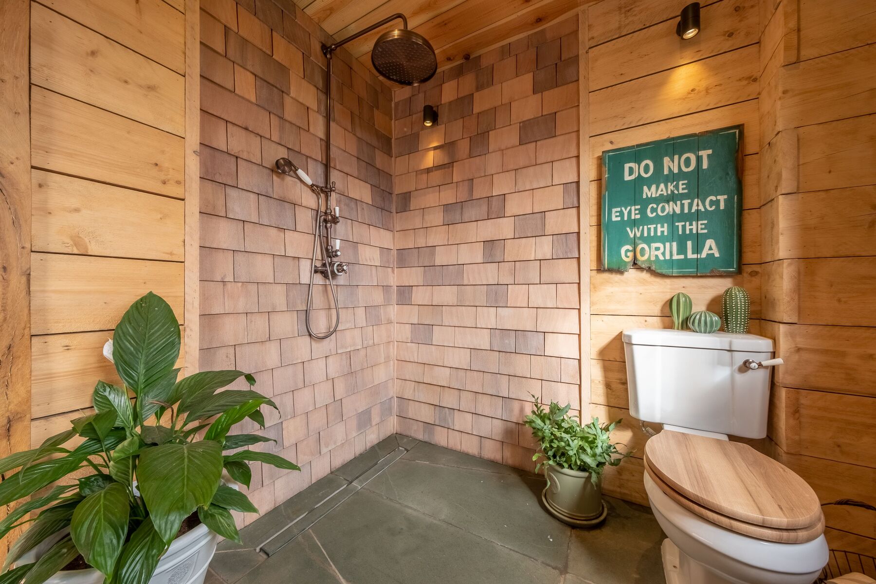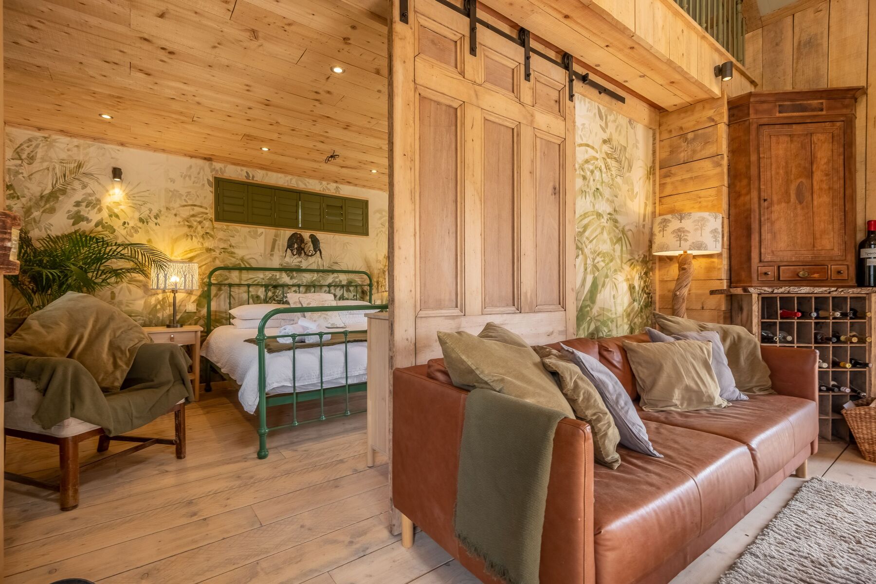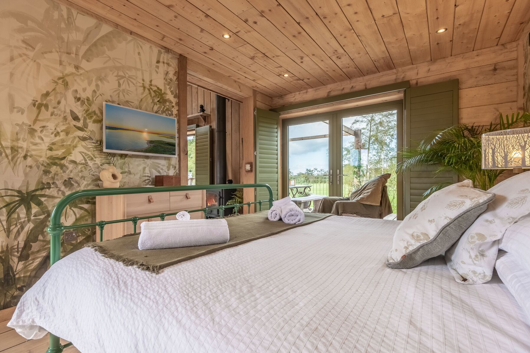 Tastefully decorated in a traditional rustic cabin style, Olive Tree House has a cosy authentic feel with internal timber clad walls, floors and ceilings throughout. The living space is open-plan and has all you need for a relaxing stay. The kitchen is well-equipped including an electric Aga and the dining and sitting area is complete with a cosy wood burning stove. French doors lead out onto the landscaped deck, which overlooks the beautiful gardens. When it's time for bed, slide back the barn door to reveal the romantic bedroom suite with its own doors to the terrace. Here you can soak in the decadent slipper bath before climbing into the comfortable cast iron super-king size bed. The owners have really thought of everything, there is even a wall mounted fire in the bedroom to keep you toasty and warm on cooler evenings. After a refreshing night’s sleep, the invigorating rain shower in the en-suite wet room is the perfect way to start your day.