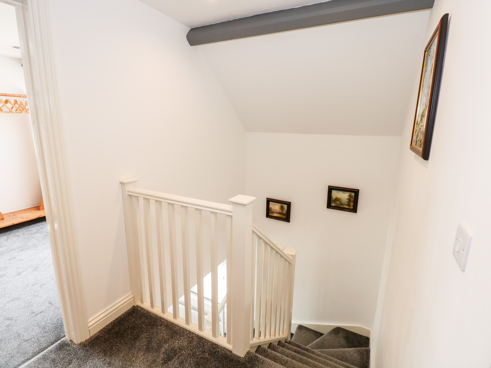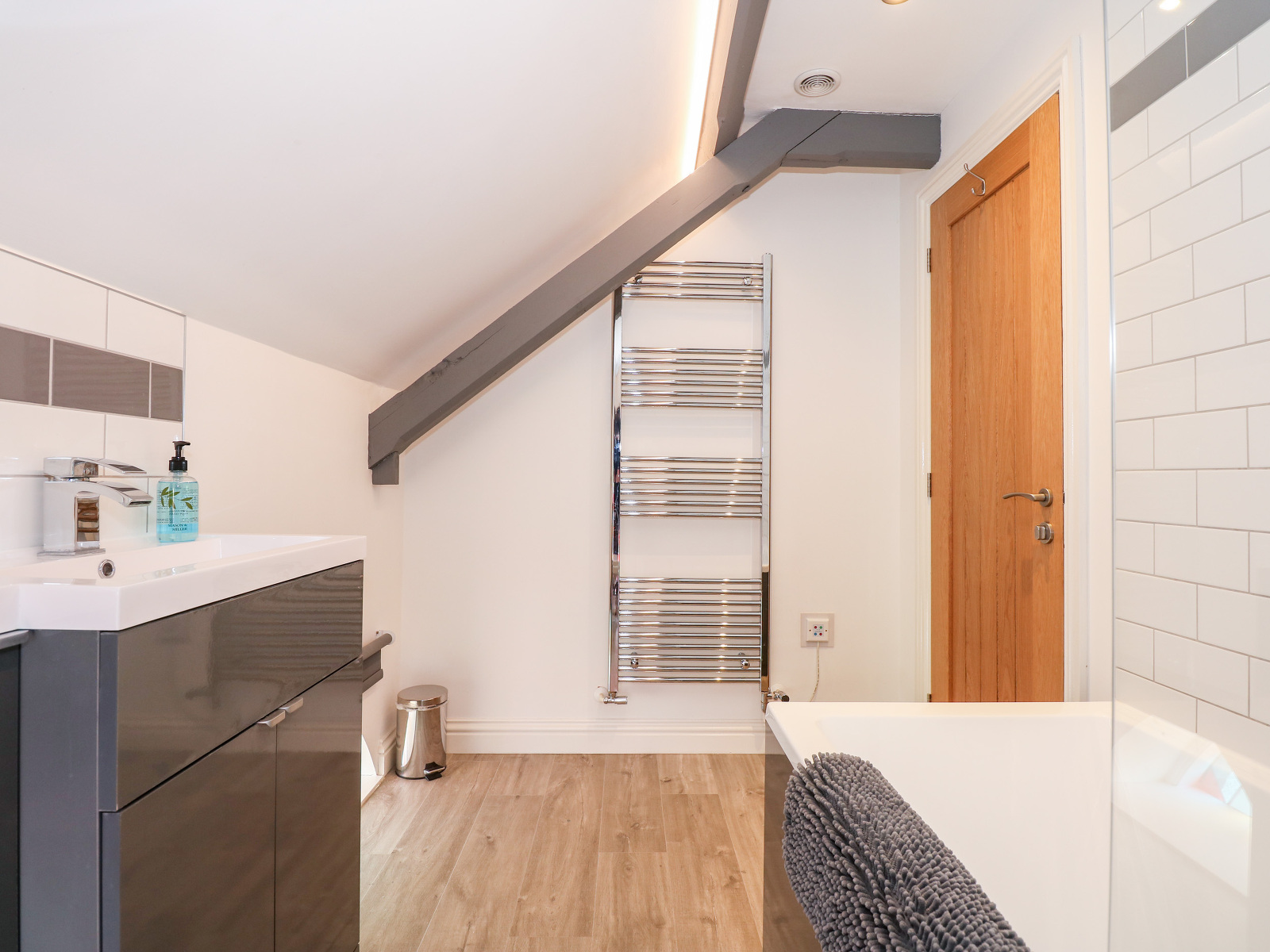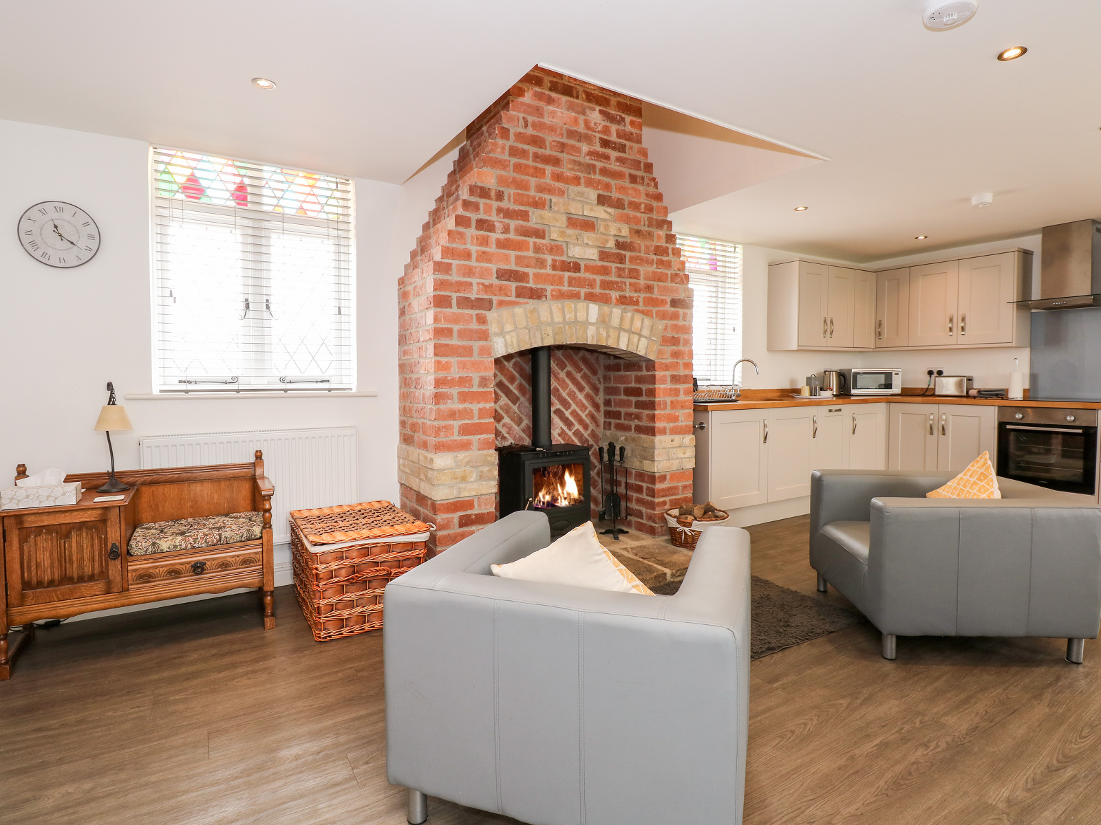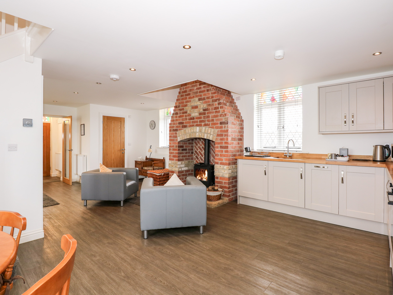 Two bedrooms: 1 x double, 1 x twin (zip/link, can be double on request). Bathroom with bath, shower over, basin, heated towel rail and WC. Cloakroom with basin and WC. Open-plan living area with kitchen, dining space and sitting space with woodburning stove.